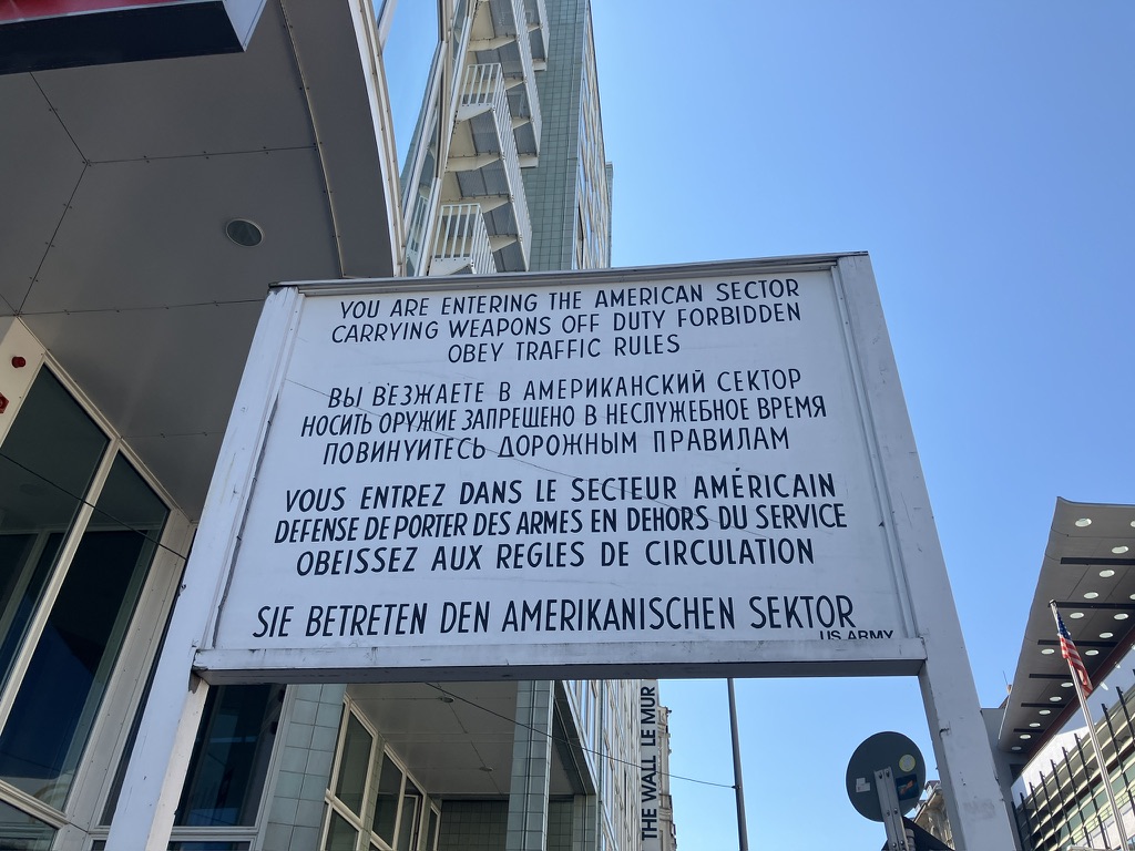 ここはかつて東西ベルリンの境界に設けられていた検問所で、アメリカ軍とソ連軍が対峙した緊張の最前線として知られています。