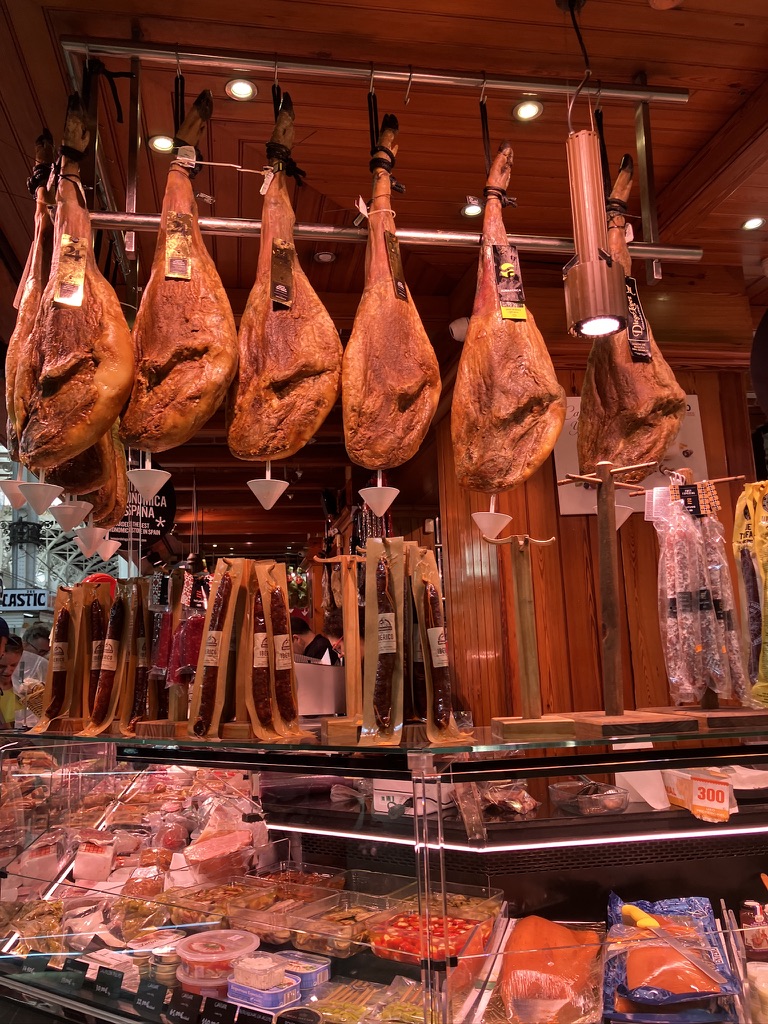 新鮮な野菜や果物、魚介類、ハムなどが並び、